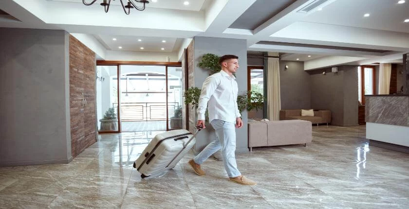 Reception and lobby floors – High-traffic zones exposed to dirt, rainwater, and suitcase wheels.